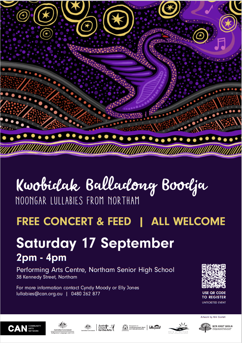 Pick up your free songbook, grab some bush tucker and be a part of this special free concert of Noongar Lullabies from Northam. Everyone welcome!