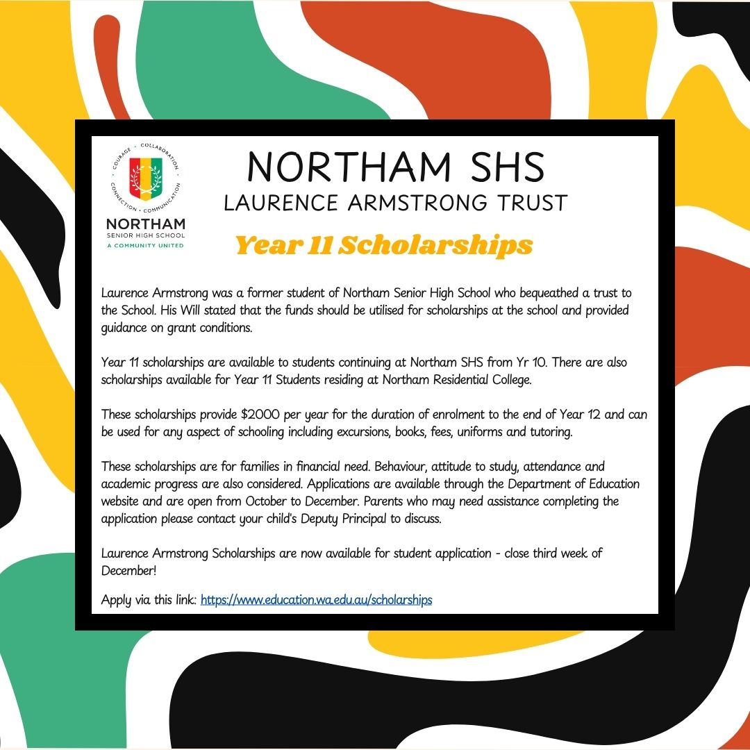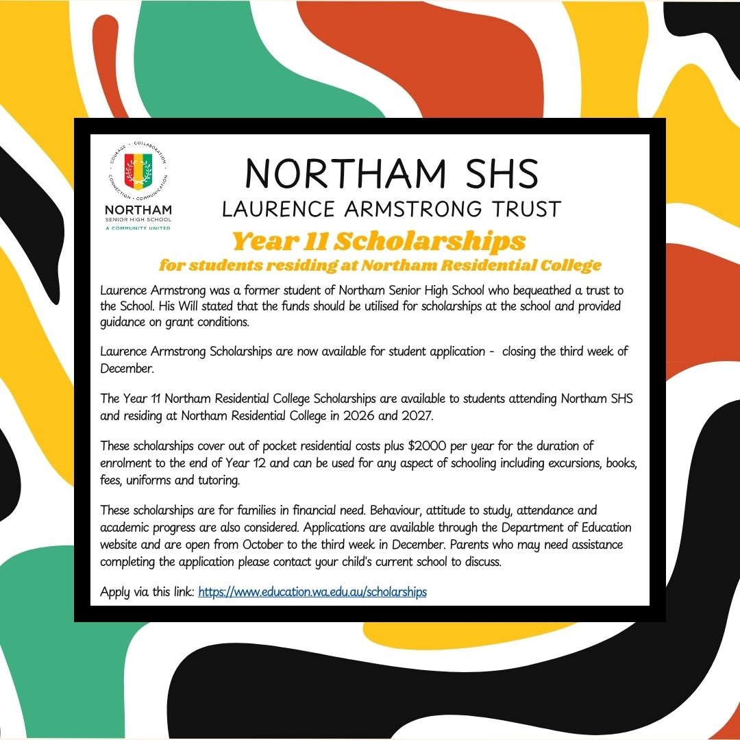 Year 11 scholarships are available to students continuing at Northam SHS from Year 10. Scholarships are also available for Year 11 Students residing at Northam Residential College.
